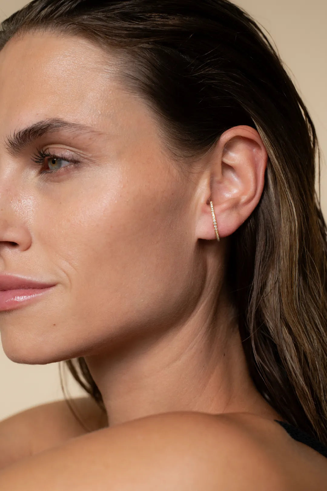 Ein zeitloser und sehr unerwarteter Ohrstecker, voll besetzt mit handverlesenen natürlichen weißen Topas-Edelsteinen. Er schmiegt sich an dein Ohrläppchen und verleiht auf besondere Weise einen Hauch von Funkeln.